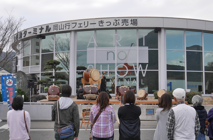 同島の表玄関・土庄(とのしょう)港にはフェリーターミナルを改装した「アートノショーターミナル」。1階ではアトリエオモヤによる太鼓のリズムに10万個のビー玉が光り、白い布が波のようにうねり反応する作品や、2階ではコシノジュンコのファッション群が出迎える。訪れた日は同ターミナルの完成式典が行われ、関係者や来賓が集まり、作品除幕式と太鼓演奏などが盛大に開催された。小豆島高校のセンバツ初出場(2日後)も重なり、島は二重の歓びに沸いていた。