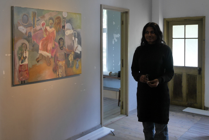 その旧醤油会館ではソサ・ジョセフ(インド)の絵画作品「What are we?」。インドの群像風景や日本滞在で感じた島の暮らしなど、ユニークな視点の絵画。