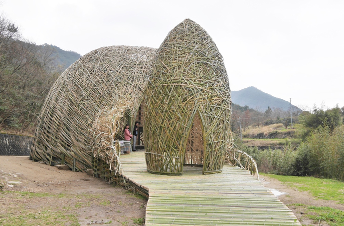島の内陸部・中山地区ではワン・ウェンチー(王文志/台湾)による「オリーブの夢」。地元住民が伐り出した5000本の竹をワンが巨大ドーム(高さ約15m、径約20m)に編み上げた。小豆島の特産品・オリーブをイメージしたという。美しい千枚田の坂道を下り作品にアプローチする行程と、内部に広がる解放感ある空間構造も合わせて楽しみたい。
