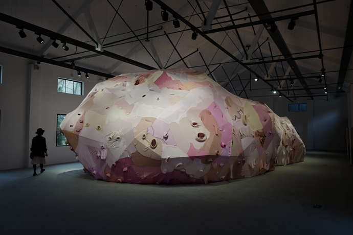 さてそんな町の外れにあった繊維工場が展覧会のメイン会場であった。改築、整備は、余計な装飾を加えず、ミニマルですっきりしている。いい趣味である。そしてそこに一室ずつかなり大がかりな映像やインスタレーションが設置してある。特にマオ・トンチャン(Mao Tongqiang)の鎌を並べた大規模なインスタレーションが注目を浴びた。またインシューゼン(Yin Xuzhen)のピンクのテントは中に人が入れる作品だ。ソンドン(Song Dong )の鏡を使ったゆがんだ部屋には、延々と続く歩道がイリュージョンで作り出されていて、興味深い。