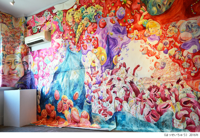 それから3年。ようやく手応えを得たのが、9月のGallery Suchiでの個展「じゅんかん」だった。同展では新作のペインティングに加えて、巨大な壁面ドローイングにも挑戦。巨大な人物の顔を挟んで広がる原初的な海生生物の楽園を瑞々しく彩り豊かに描き出して好評を得た。「大学院を出て初めてというくらい、冷静に考えながら制作できました。これでやっとスタートラインに立てたという気持ちです」。