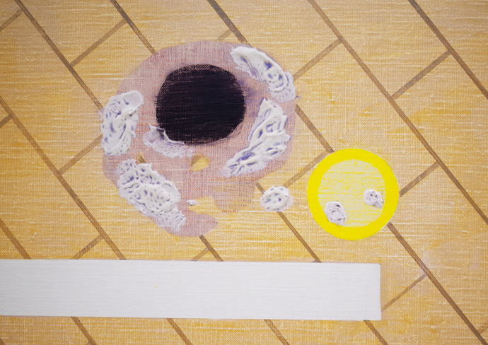 盆踊りの光景やサンドウィッチの断面、赤ちゃんの蒙古斑。生活の中のモチーフを少し可笑しく捉えた油絵は、幼い頃の記憶を基に描くことが多い。今年6月の第53回神奈川県美術展では平面立体部門の大賞を受賞。その作品《浴場》を間近で見ると、様々なマチエールが共存し、泡やシャワーの水は非常に厚塗りであることに気づく。「描写するというよりも、絵具そのものが泡や水になればいいという感覚。絵具に‟化けて”もらおうと思って描いています」。