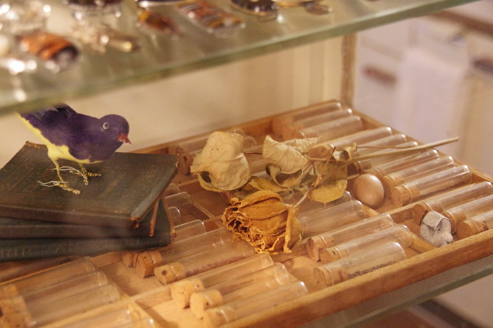 アトリエは蒐集したレトロな小物で溢れている。