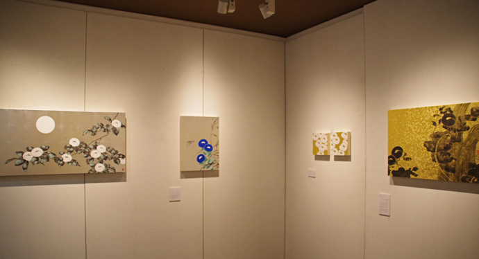 (右)《菊》2019年 50.0×37.5cm 顔料、アクリル、墨、金箔、膠、和紙、木製パネル