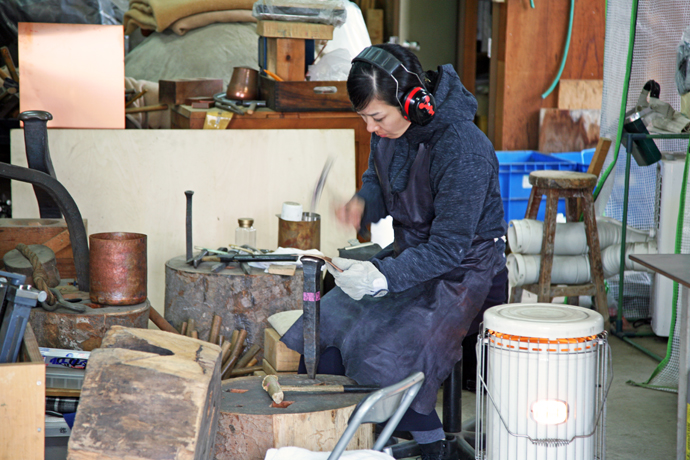 糸賀英恵は多摩美術大学デザイン科で鍛金の技法に出会い、金鎚で銅板を叩き自らイメージするフォルムに近づけていく面白さに夢中になった。