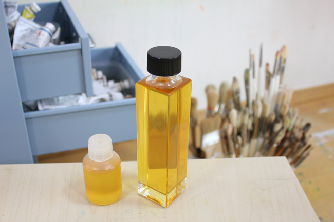 完成したペインティングオイル。ガラス瓶やポリボトルに詰めて保存している