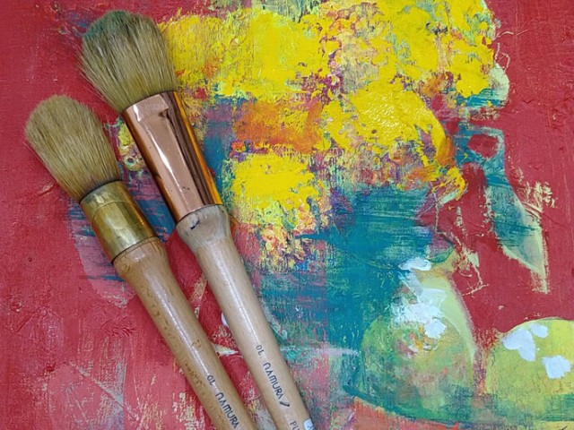 絵描き仲間に名村のOLブラシという極太の筆を紹介された。画材屋に行くとよく見かける筆で、どういう時に使うものなのか分からず、一度も使ったことがなかったが、以来、なければ描けないほどの必須アイテムとなった。