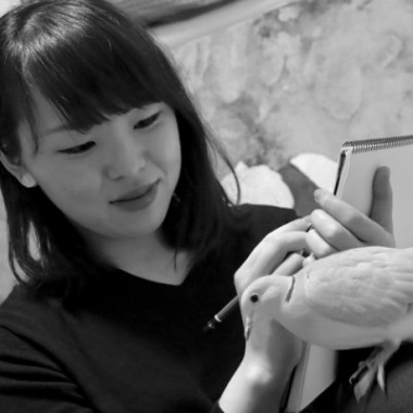現在、夫と5羽の鳥たちと暮らす河本が花鳥をモチーフとし始めたのは大学院に進んでから。きれいな描線や静謐な画面づくりを追求する内、心地よい余白の傍ら四季折々の小さな生き物や草花が息づくようになった。何より、描いていて癒される。自身含め、“一息”つく場所を求めている人は多い。