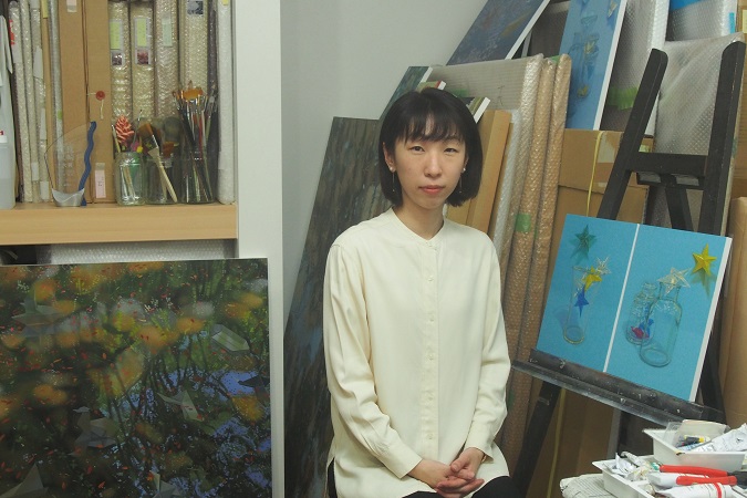 近年は、鑑賞者と様々なイメージの対話が生まれるよう、抽象的な風景の中に折り紙のオブジェを登場させた。作家の手で折られた星たちは、先行きが見えないこの時代に人々の心に向かって浮遊し、静かに光り続けている。