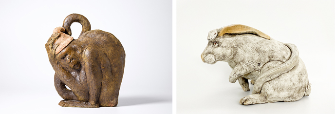 北郷の手が生む陶のオブジェは、擬人化したり感情を持たせたり、動物と人間を重ねる部分がある。短編が添えられた作品も多く、その物語性は人の想像力を喚起する。