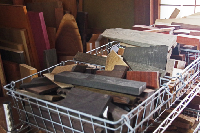 ゴミ箱から端材を集めたり、知り合いから貰ったり、ホームセンターやネットオークション……その積み重なりで集まった、無数の木材。「作品のために買う、というより、自分が惚れた木で作りたいです」。
