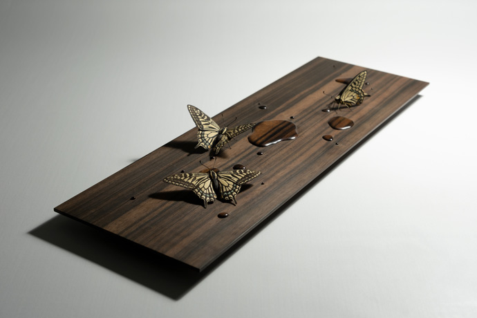 象嵌主体の作品を作ろうと福田が編み出したのが、伝統的な木象嵌技法を立体彫刻に応用した「立体木象嵌」。最初の作品は蝶、今も昆虫は主なモチーフだが、何より大切にする創作の原点は、木の魅力を伝えること。その作風の大きな特徴の一つが木の色味を活かした無彩色で、《吸水》の蝶の羽は多様な木の組み合わせで表現し、水滴は黒檀の板を掘り下げ研磨することで生み出した。