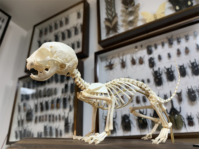 アトリエの壁には、所狭しと様々な標本が飾ってあります。これは、普段の生活から目に付くすべての場所で昆虫を意識できるようにと配置しています。日々昆虫に囲まれ、他の生物との違いと共通点を探る。そうして人間と遠い生き物である昆虫を深く知っていくと、我々人間も全く同じ地球上に生きる生物であると、改めて意識することができます。