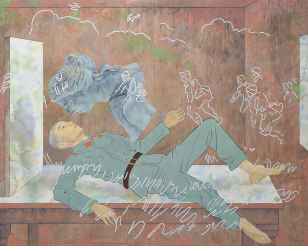 大学院で師事した故小池一範の教えの中で、特に制作と結びついているのは、人物を描く時、背景と均しく描くこと。人の姿を図、背景を地だとすると、同じ量感をもたせて図を浮かないようにするためだと解釈した。「ある人の肖像画を描いた時、セーターの網目を描いていくうち、顔や手よりも網目の方がその人をより表していて、近づけた実感があったんです。紐を編む・結ぶ・解く行為は人間だけができる人的なモチーフだと思い、人物の周囲に紐を張り巡らせる作品が生まれました。それが人と人以外を等価にすることの、自分なりの答えの出し方でした」。