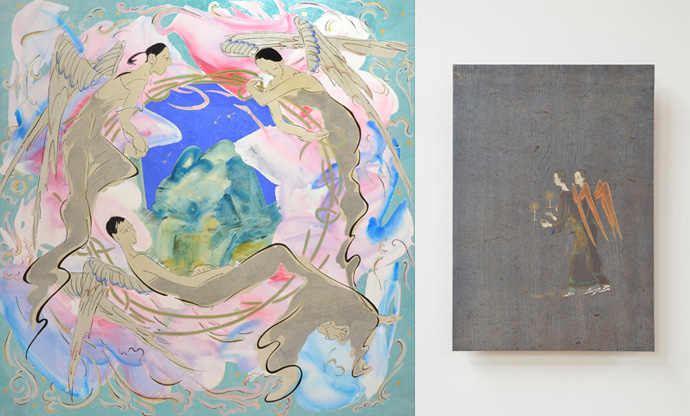 (左)《花輪》2024年 162.3×162.3cm 紙本着色 (右)《怖くない天使》2024年 39.4×27.9 cm 坂本直昭 染描紙に着色