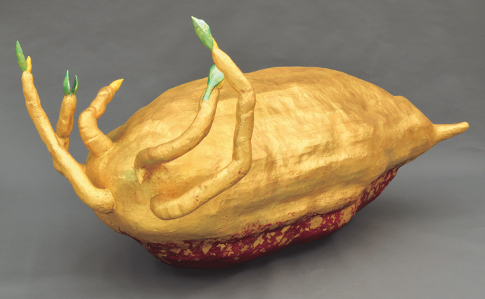 《黄金甘藷芽出(いず)る》 2021年 「第74回二紀展」出品 力強く生え出る芽には、生命のエネルギー、再生、循環のほか、作家自身の成長への思いも込められている。