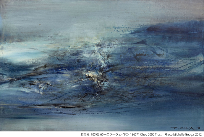 先進的な指導で知られる杭州の中国美術学院を41年に修了したザオは、西洋のモダニズムを中心に中国の古典なども交えて研究を重ね7年後に渡仏する。ここから甲骨文字や子供時代に習得した書が前面に出始めてザオ独自の抽象様式が確立される。特に重要なのは「中国独自であり、しかもモダニズムを具現した絵画」を目指したザオの模索だろう。日本のみならず非西洋諸国の近代の形成に共通する課題でもある。
