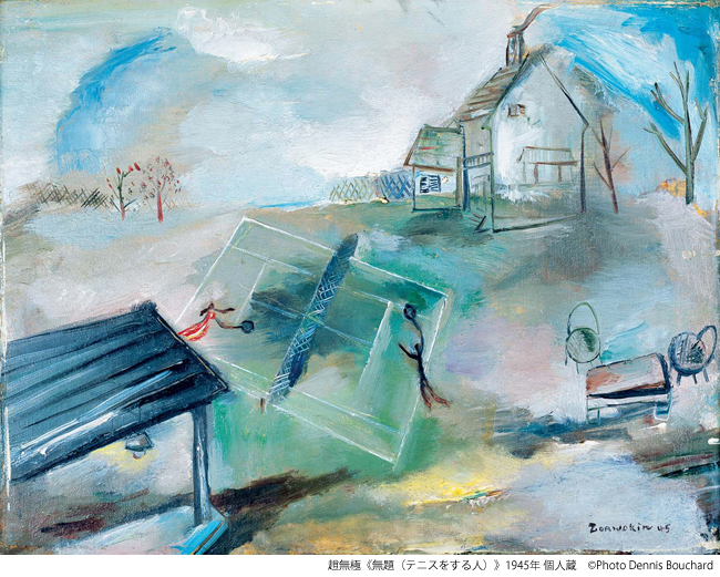一般には、ザオ様式成立にはパリ移住後の影響が大きいとされているが、同展を共同企画したメリッサ・ウォールト、アンケニー・ワイツ、ミシェル・ユンが展覧会図録でも詳細に分析しているように、初期の段階での東西両洋への挑戦が、パリ以後の準備となっている点は見逃せない。たとえばシャガール、セザンヌやクレーなどへの傾倒が、漢代の石碑や瓦の拓本への熱中と共存して叙情的な光景を現出する。ただ、ごく初期の45年の《テニスをする人》を見ても、ザオの学習が表面をなぞるのではなく、先人の表現の「精神を学ぶ」こと、つまり「根源的学び」だったことが理解できる。