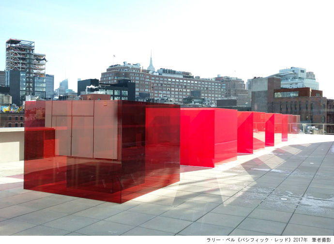 マンハッタンのスカイラインを背景にしたテラスに彫刻を設置して気をはいているのがベテランのラリー・ベル。60年代に西海岸派ミニマリズムの代表格だったが、3月初旬にあったアーモリー・ショーや全米美術商協会のフェアでも目立っていた。特殊加工されたガラスの箱は、日光を浴びて赤い影を床に落とし複雑な空間を作り出す。