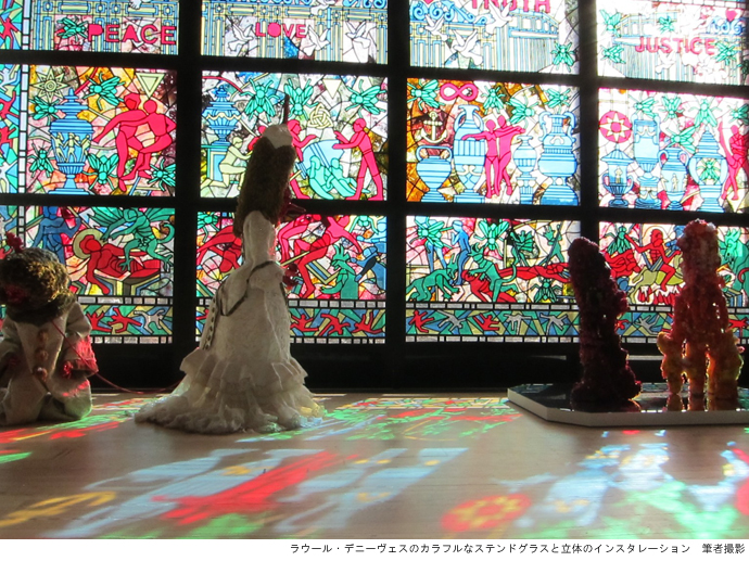 またラウール・デ・ニーヴェスは、カラフルなビーズやプラスチック、布地などで構成したライブ感覚の人物彫刻で知られているが、天井まで届く大きな窓にステンドグラス風に透過光の壁画をデザインして一体感のある空間を演出している。