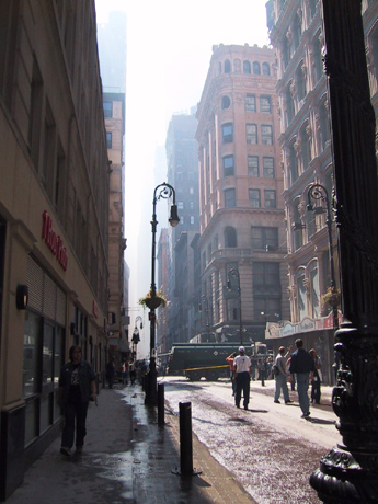 9/11後、給水車が出て清掃中のウォール街地区。路上に水が残っているのが見える。筆者撮影