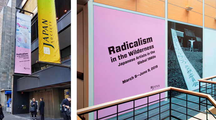 (左)松澤宥《消滅の幟のパフォーマンス(御射山秘儀)》1970年の写真(羽永光利・撮影)を使った会場入口。Photo: Richard Goodbody 提供:ジャパンソサエティ