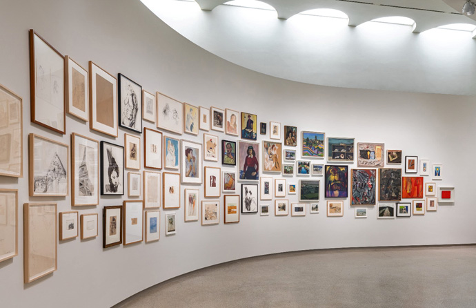 「アーティスティック・ライセンス」展。天井までサロン形式でギッシリと若描き小品をならべた蔡國強企画部分の展示風景