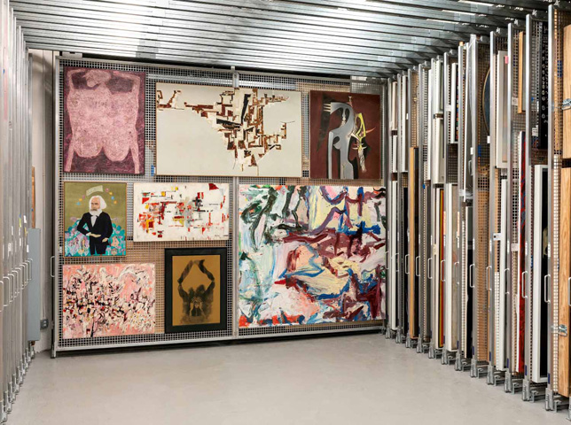 グッゲンハイム美術館の収蔵庫。デビュフェ(左上角)やデ・クーニング(右下角)の作品が見える。Photo: David M. Heald