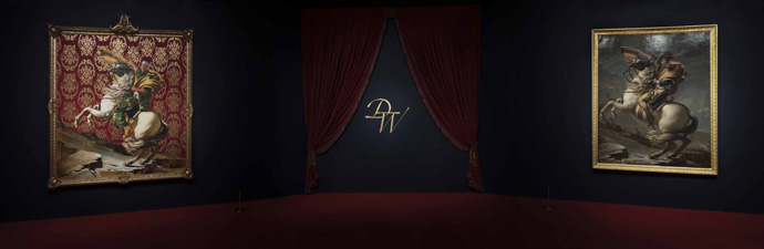 ブルックリン美術館「ジャック=ルイ・ダヴィッドとケヒンデ・ワイリーの対決」展の展示風景。ワイリーの2005年作品(左)とダヴィッドの1800-1年作品、ともにタイトルは《ベルナール峠からアルプスを越えるボナパルト》。それぞれの頭文字WとDをロゴにしたゴージャスな展示空間の演出だ。