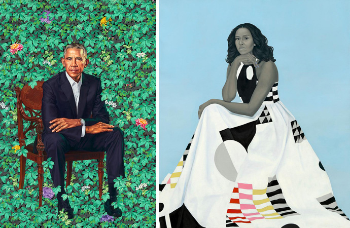 ワイリー《バラク・オバマ》(左)© 2018 Kehinde Wiley。右側は対になる《ミシェル・オバマ》夫人の肖像でエーミー・シェラルド作。ともに2018年、カンバスに油彩、国立肖像美術館蔵
