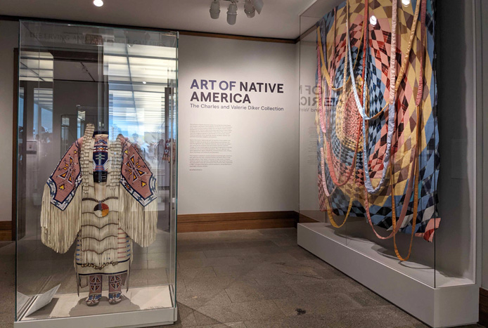 アメリカ先住民美術部門の入り口。左手前はジョディ・アーチャンボールト《女性用北部伝統舞踊服とアクセサリー》北ダコタ州、2005年。右壁はマリー・ワット《無題(ドリーム・キャッチャー)》2014年。筆者撮影
