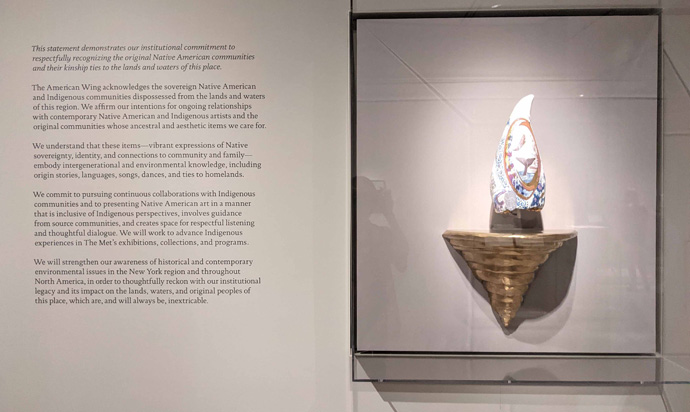 いわく「メトロポリタン美術館はレナペホーキング部族の祖地であり、多くの先住民部族の歴史的集会交易地であるレナペ居住地に位置する。私たちは過去・現在・未来のすべての先住民共同体がこの地と継続的かつ根源的関係を持つことを認め敬意を表する」。