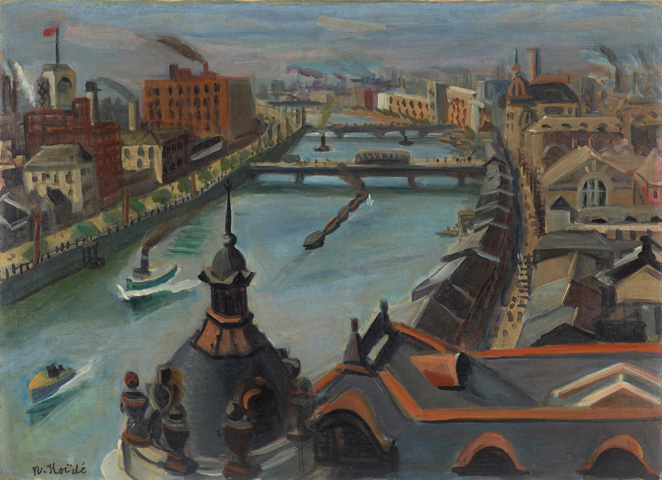 しかも、美術と大阪の歴史が密接に関係している。川瀬巴水や織田一磨の版画による道頓堀風景もよいけれど、洋画の国枝金三や松井正の描いた信濃橋の新しい都会風景は格別だ。何より小出楢重が国枝や黒田重太郎と1924年に設立した信濃橋洋画研究所が、どれほどモダンな企図だったか、ずばり立地条件が語っている。翌年には中之島に朝日会館が「文化の殿堂」としてオープンし、信濃橋洋画研究所が全関西洋画展をここで立ち上げる。さらに31年に朝日会館に東隣して建設された朝日ビルディングに同研究所は移転、中之島洋画研究所と改名している。