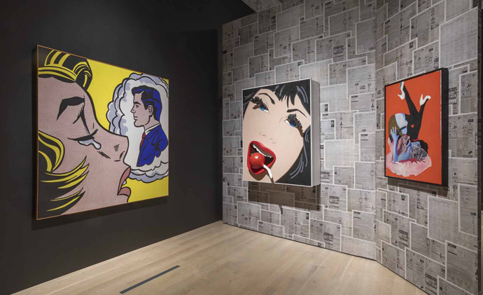 ジューイッシュ・ミュージアム「ニューヨーク:1962-1964年」展の展示風景。左から:ロイ・リキテンシュタイン、マージョリー・ストライダー、ロザリン・ドレクサーのポップ作品 Photo © Frederick Charles, fcharles.com