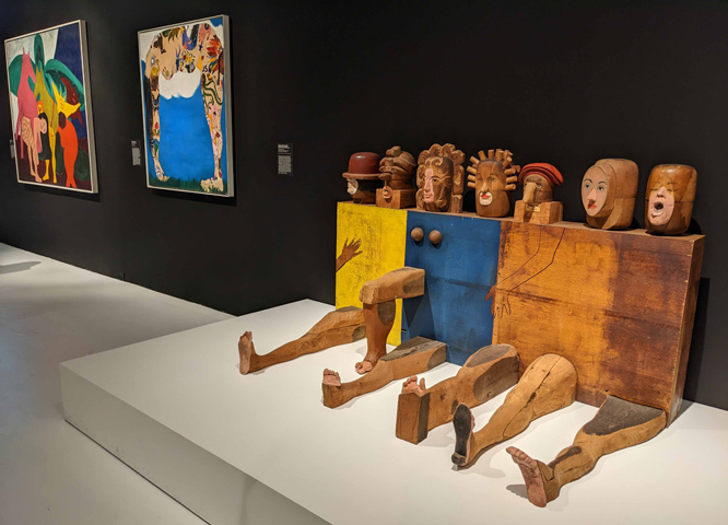 ジューイッシュ・ミュージアム「ニューヨーク:1962-1964年」展の展示風景。左から:ボブ・トンプソン、マーサ・エーデルハイトの絵画とマリソルの立体 筆者撮影