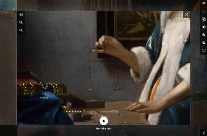 このオンライン・ツアーをマスターしたら、自分で作品を選べるオプションに進んで、細部を拡大したり、黄色いジャケットや真珠など特定のトピックを複数の作品を横断して学習するなど、探索の可能性は計り知れない。