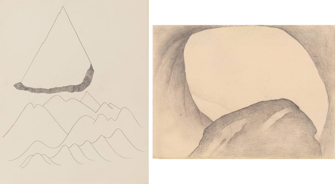 たとえば、ジョージア・オキーフの鉛筆の抽象風景に、やはり鉛筆の省略筆法で記されたウォルター・デ・マリアの山並みの光景が並ぶ。ともにニューメキシコの自然の中で作品を作ったことを思えば、喚起的な並置だ。