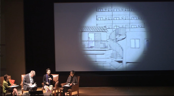 「ラッド・スミス日本美術プログラム」2023年6月4日ボストン美術館。左から:同館キュレーター、アン・ニシムラ・モース、通訳、束芋、筆者。背景のスライドは束芋《お化け屋敷|Haunted House》2003年の一シーン。記録ビデオのスチル画像提供:Museum of Fine Arts, Boston
