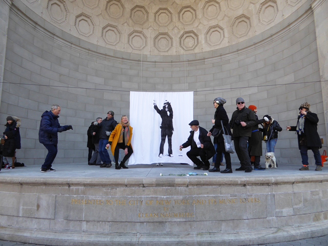 2023年2月18日にセントラルパークの野外音楽堂で行われた《ヨーコ・オノのための朝の曲》。垂れ幕のヨーコのイメージはイギリスのアーティストSTEWYの作品。主催者のフィリップ・ワードは垂れ幕の右側手前の半かがみの男性。Photo: Karen Sheinheit