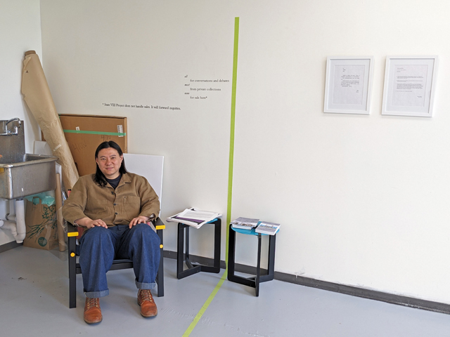 「State Ⅷ Project」を主宰する錢同濟。薄緑色のテープの左側がスタジオ・スペース、右側がプロジェクト・スペースとなっていて、王狼狗の2017年作品《Instructions》が展示されている。