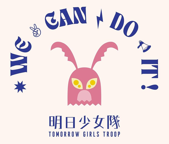 何より、数人のグラフィック・デザイナーを擁していて、明日少女隊の日本語のロゴや、作品集のタイトル『We Can Do It!』のタイポグラフィー、広報や啓蒙のための各種シールには洗練されたデザイン感覚が光っている。また、蚕と兎をハイブリッドしたショッキング・ピンクのマスクも、きもかわいい。