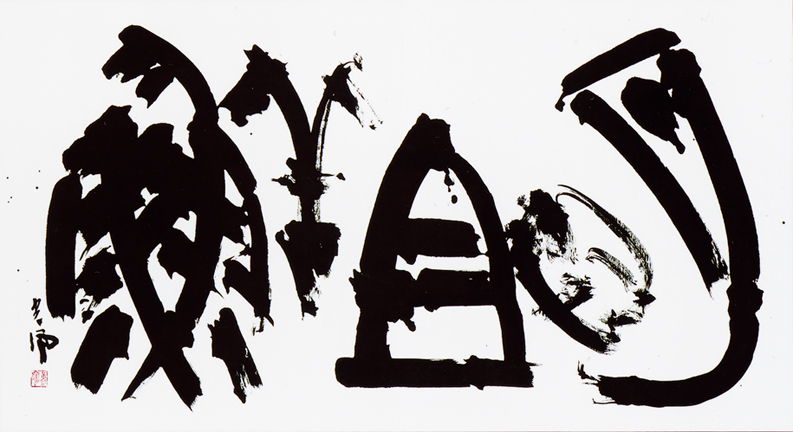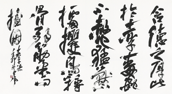 「回顧自選作品」「新作・老子荘子語句」の二つの構成にしました。「回顧自選作品」では、第34回謙慎書道会展で西川春洞先生記念賞、第4回改組日展で特選を受賞した35歳・1972年を大きな節目と考え、この年以降の作品を陳べます。これまで比較的多く発表した横形式の作品が多いです。また「新作・老子荘子語句」は、過去にも何回か書いているのですが、老子・荘子の名言名句に内蔵されている言葉の奥義、言葉の響き、それらに感銘を受けたことがしばしばあり、選びました。