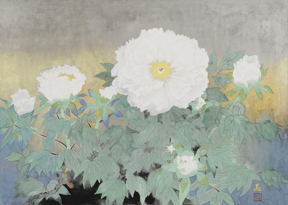 今回の新作の「夏彩」は桃と草花を組み合わせた作、季節感、色彩が見どころとなっており、白牡丹の「白富貴」は、大輪の牡丹が見事な風格を見せている。「早春賦」は、紅白梅と慈姑が薄紅色を背景に配され、薄紅色が曙を暗示し、梅が花開く時をよく示している。