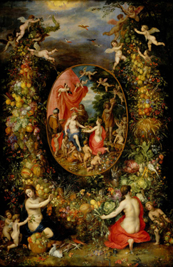 ヤン・ブリューゲル(父)およびヘンドリック・ファン・バーレン「四季の精から贈り物を受け取るケレスと、それを取り巻く果実の花輪」1621-1622年頃 マウリッツハイス美術館蔵