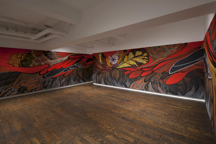 熱帯を思わす植物のモチーフや、赤や金の色彩はジャカルタで幼少期を過ごした経験が大きい。今展でも、日本画材を用いつつ、日本画の枠をこえた独自の表現を大作にて発表。飲みこまれるような迫力ある“熱気”と向きあいたい。