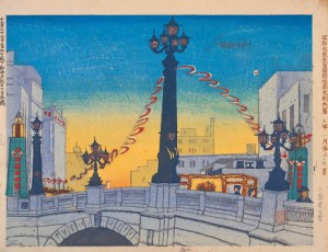 例えば、歌川広重の「名所江戸百景 日本橋雪晴」のように、権威の象徴である江戸城と日本一の富士山を背景に、江戸の経済力と活気に満ちた魚河岸と一緒に描かれる日本橋は、まさに都市江戸の繁栄を象徴する光景となり、人気の名所絵となった。そして明治維新を迎えると、人力車旗揚げの場所に選ばれた日本橋は、人力車をはじめとする最新の乗り物とともに描かれていき、文明開化を象徴する場所となる。また明治44年(1911)に日本橋が石造の橋に架け替えられてからは、橋そのものが、近代都市東京の風景を彩るひとつのアクセントとして注目を集める。小泉癸巳男(こいずみ・きしお)の祝日を画題とした作品では、より明るく華やかな都市風景の中心に、日本橋がすっきりと浮かび上がっている。