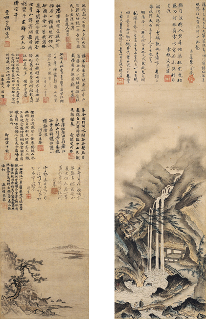 (左)重要文化財「江天遠意図」 伝周文 大岳周祟他11僧賛 1幅 室町時代 15世紀