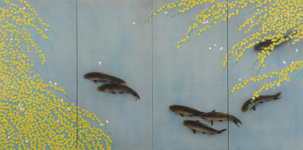 4曲1隻屏風「麗日遊鱗」は、水に遊ぶ鯉と、水面を覆う黄色い山吹を描いたもの。6匹の鯉はどれも写実的にきっちりと描かれ、文句のつけようがない。爛漫と咲く山吹と、そこに遊ぶ紋白蝶がいかにも春の長閑さを伝える。