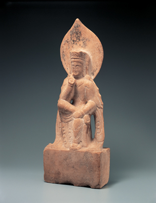 右脚を組み上げ左脚を踏み下ろし、右手人差し指を頬に当てた半跏思惟像。今展では石の彫刻と青銅器等を合わせ「金石」と題した展示を行う。古より永遠を象徴する金石によって稀有な美的体験が出来るだろう。