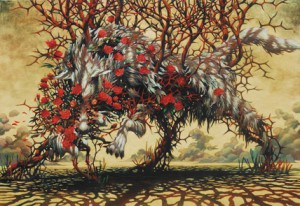 初鹿野は主にクレパスを素材に用い、動植物をモチーフに「生命」をテーマとした作品を制作している。今展では100号程度から小品まで10数点を展示予定。
